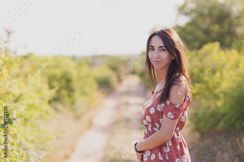 Summer lifestyle portrait of beautiful romantic girl holding bouquet of wild flowers.