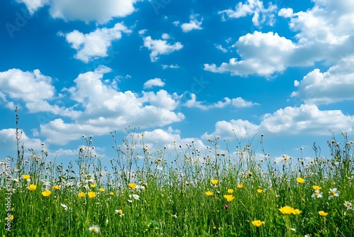 Summer meadow with blue sky, white fluffy clouds and yellow wildflowers