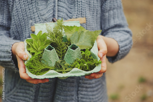 summer outdoor activity for kids - scavenger hunt, leaves sorting in egg box, nature exploration