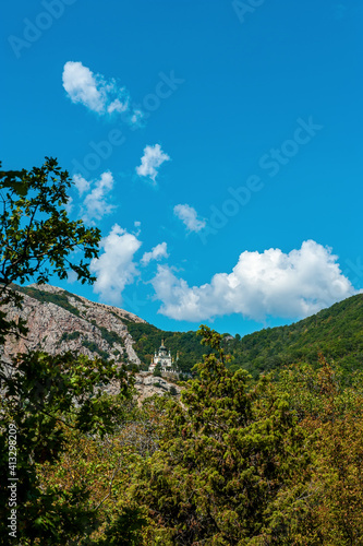 Summer sunny view of the Crimean road in the mountains. Beautiful mountain landscape of the Crimean Peninsula. In the distance, the Church of the Resurrection of Christ in Foros