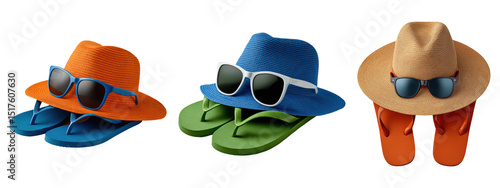 Summer travel accessories with hats, sunglasses, and flip-flops isolated on transparent background