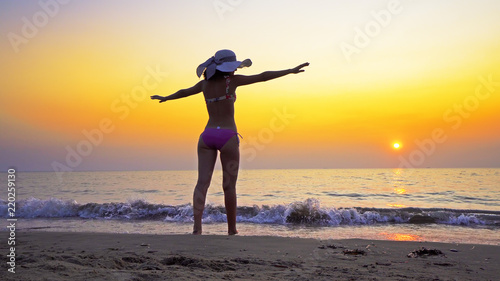 Summer vacation travel concept. Young teen in bikini wearing hat spreading hands outstreched wide open against sea sunset