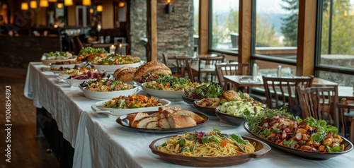 Sumptuous Buffet Feast Colorful Salad Bar in Cozy Restaurant Setting, Woodland View, Warm Hospitality Food Event Catering Concept