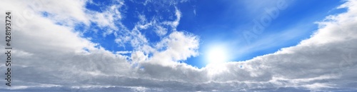 Sun among the clouds on a blue sky, cloudy landscape with the sun, flying in the clouds, 3D rendering