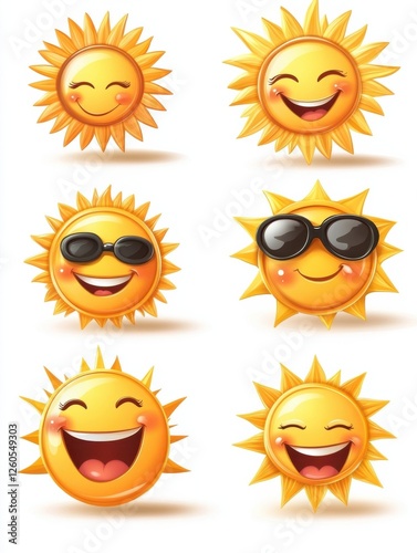 Sun emoji. Funny summer sunshine, sun baby happy morning emoticons. Cartoon sunny smiling faces vector icons