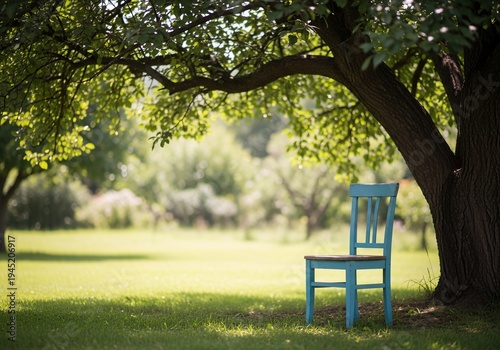 Sun Faded Blue Wooden Chair Under Large Leafy Tree in Peaceful Sunwashed Summer Garden with Soft Focus Background