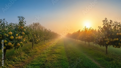 Sun rises over a beautiful fruit orchard with trees in rows