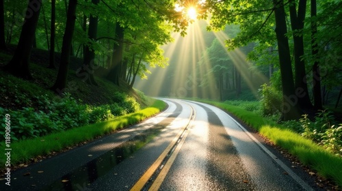 Sunbeams illuminate a winding road through a lush green forest