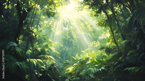 Sunbeams Illuminate Lush Tropical Rainforest Canopy