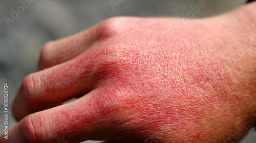 Sunburned skin on hand shows redness and irritation, indicating overexposure to sunlight. texture appears rough and dry, highlighting need for sun protection