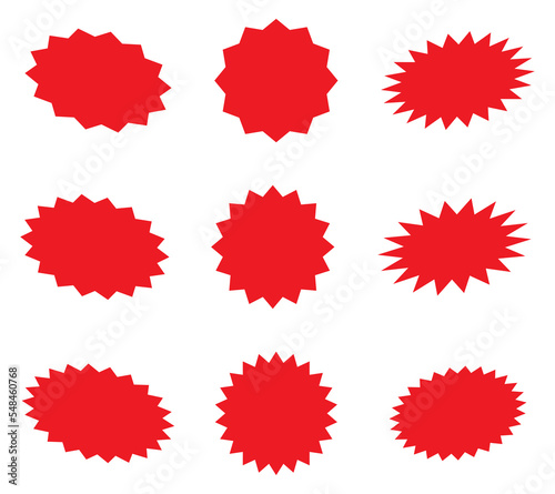 Sunburst promotion tag, starburst red speech bubbles, bursting sticker promo badges. Explosion star button vector illustration.