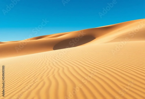 Sun-drenched dunes, sweeping sand, dramatic shadows, clear blue sky, arid, Sahara