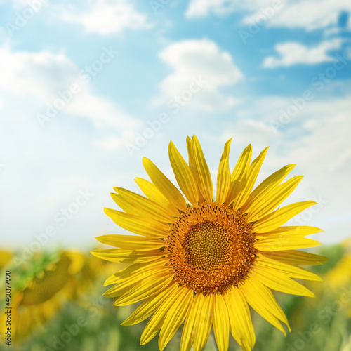 sunflower closeup on field with blue sky and clouds on background