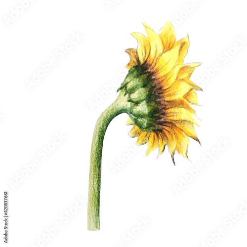 sunflowers isolate on white. Hand drawn. Watercolor pencils