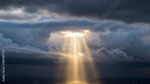Sunlight breaking through dark storm clouds over the ocean.