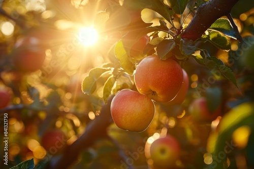 Sunlight filters through an apple orchard, highlighting ripe apples on a branch