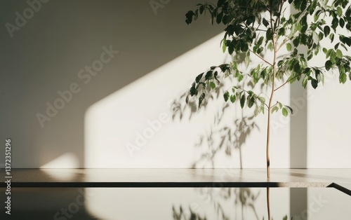 Sunlight Illuminates Minimalist Room with Small Tree and Dramatic Shadows