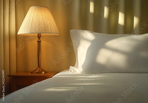 Sunlight on Bedroom Bed with Lamp and Pillow