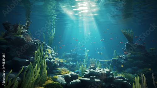 Sunlight shining through underwater landscape and seabed covered with green seaweed