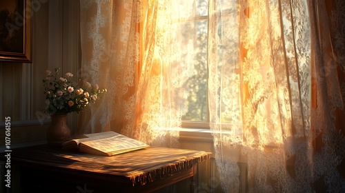 Sunlight softly filtering through lace curtains, casting delicate shadow patterns onto a small reading table, warm glow adding a touch of tranquility, photorealistic, hd quality, cozy atmosphere.