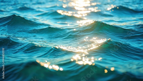 Sunlight sparkles on gentle, rippling ocean waves, creating a serene blue and turquoise water surface.