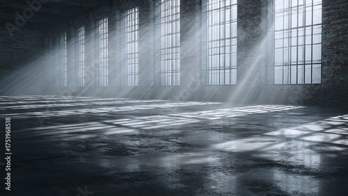 Sunlight Streaming Through Windows in a Large Concrete Warehouse with Textured Floor