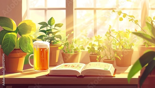 Sunlight streams into a windowsill filled with potted plants, a glass of light beer, and an open book