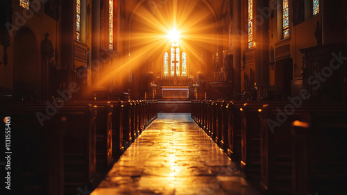 Sunlight streams through stained glass in a sacred Catholic sanctuary