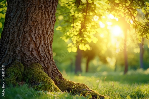 Sunlit forest scene, mossy tree base in vibrant green grass, peaceful nature.