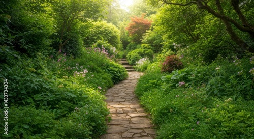 Sunlit garden path, lush greenery
