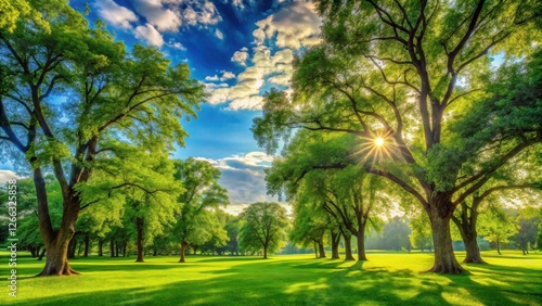 Sunlit Meadow with Lush Greenery and Majestic Trees Under a Vibrant Sky