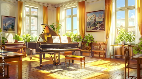 Sunlit Music Room with Grand Piano and Art Deco Decor