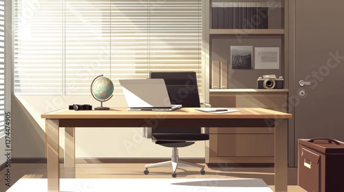 Sunlit office desk, laptop, globe, camera; background bookshelves, briefcase