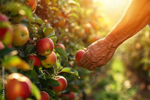 Sunlit orchard scene captures the essence of apple harvesting, with farmer's hand reaching for ripe fruits. Perfect for nature-inspired marketing or agricultural blogs.