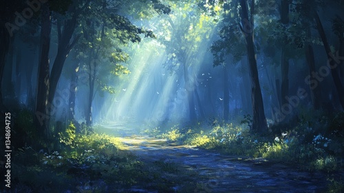 Sunlit Path Through a Mystical Forest