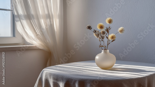 Sunlit room with white curtain round vase dried flower soft shadow minimal decor cozy atmosphere morning light tranquil mood