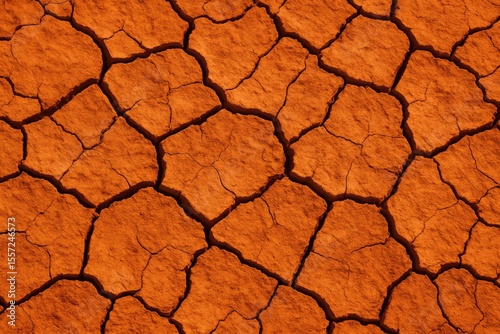 Sunlit scene featuring arid cracked earth with reddish clay and a barren landscape