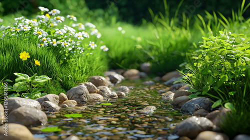 Sunlit Stream with Daisies and Lush Green Vegetation