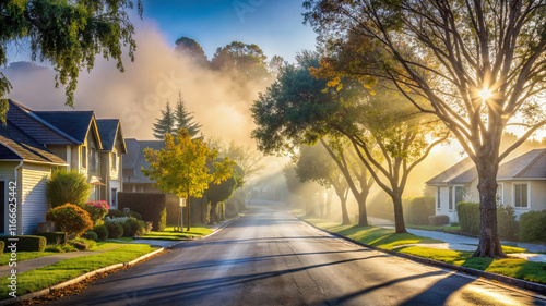 Sunlit suburban street with morning mist