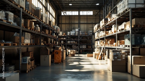 Sunlit warehouse interior with rows of stacked cardboard boxes on metal shelving units.