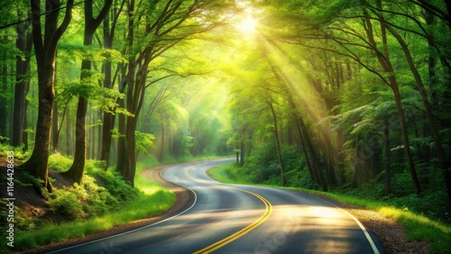 Sunlit Winding Road Through Lush Green Forest Canopy