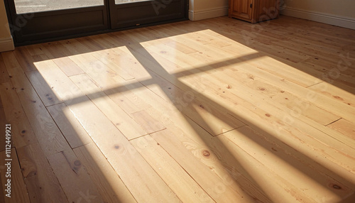 Sunlit window shadows on a wooden floor in a warm interior