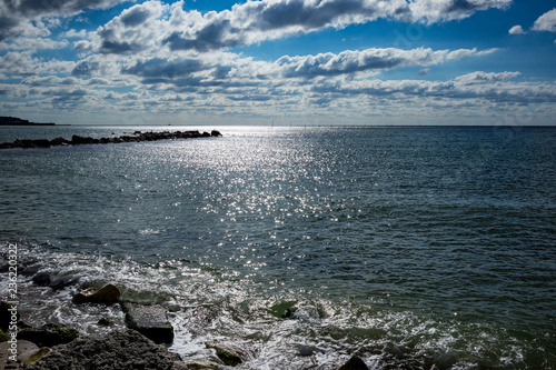 Sunny autumn day landscape, rocks at the shore of Black Sea, seascape picture against the Sun near Balchik, Bulgaria with light reflection