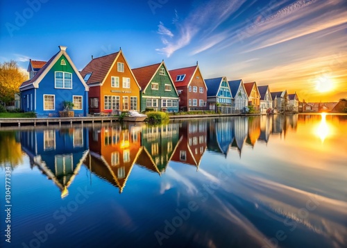 Sunny Day in Dutch Canal Village: Vibrant Wooden Houses, Long Exposure Photography