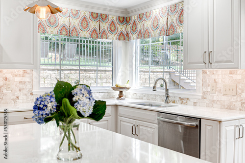 Sunny kitchen window hydrangea flowers floral vase luxury interior kitchen