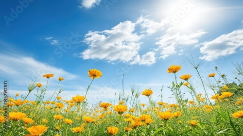 Sunny Meadow Vibrant Yellow Flowers Under Blue Sky.