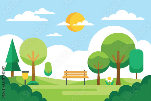 Sunny Park Landscape with Trees Bench and Blue Sky Flat Design