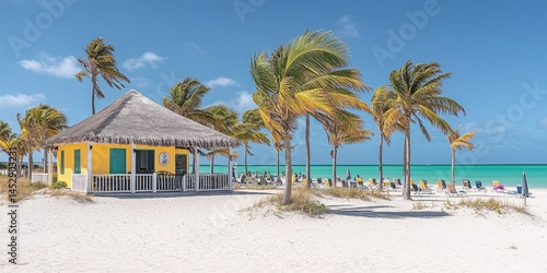 Sunny tropical beach hut on white sand.