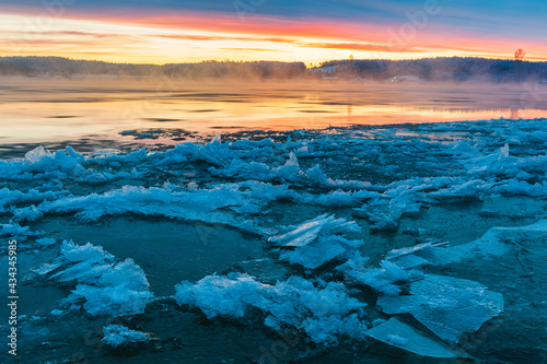 Sunrise at icy river, Sweden