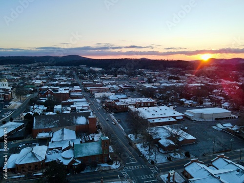 Sunrise light reveals the remaining snow left on the ground and buildings. Small rural town with several neighborhoods around it and historic homes and buildings